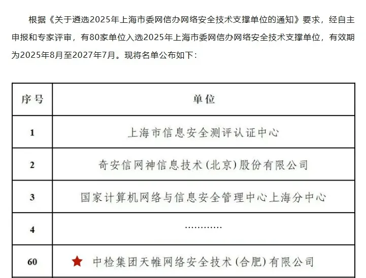 近日,上海市委网络安全和信息化委员会办公室(以下简称“上海市委网信办”)公布了2025年上海市委网信办网络安全技术支撑单位名单。tyc1286太阳成集团凭借出色的技术和全链条的网络数据安全合规治理能力成功入选。