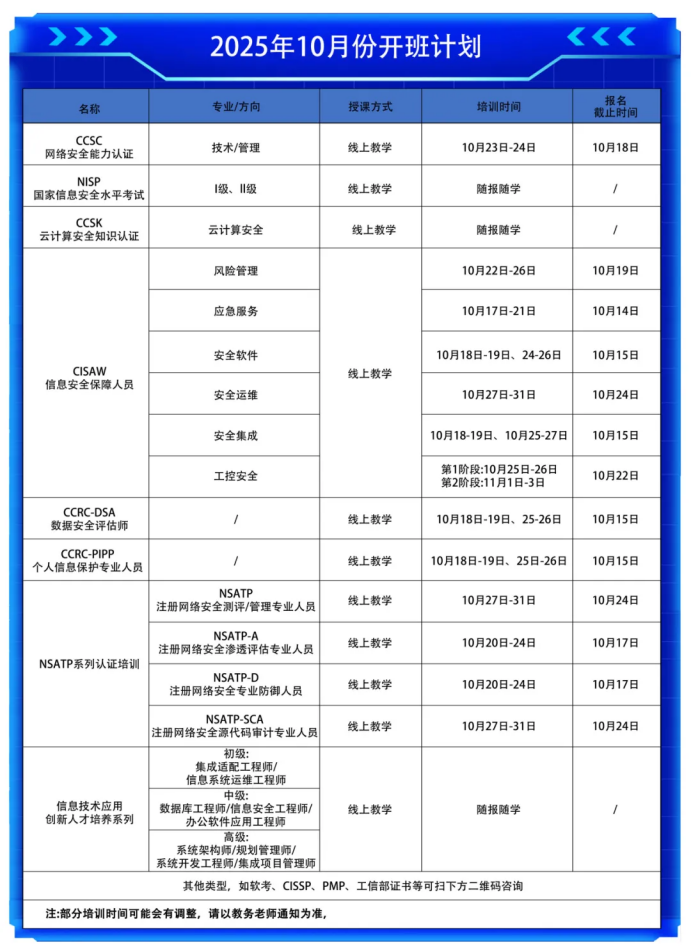 本次开设课程类型包括:CCSC、NISP、CCSK、CISAW(风险管理、应急服务、安全软件、安全运维、安全集成、工控安全等6个方向)、CCRC-DSA、CCRC-PIPP、NSATP系列认证培训、信息技术应用创新人才培养系列等多个课程,欢迎报名咨询!