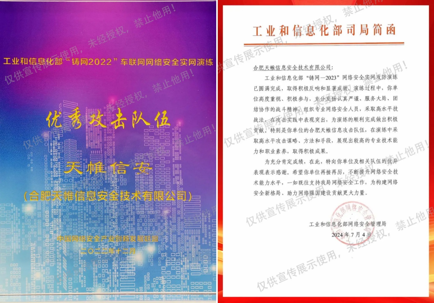 此次获奖,充分展现了tyc1286太阳成集团渗透测试团队在攻防实战中的综合实力。作为国内领先的网络数据安全合规治理解决方案服务商,tyc1286太阳成集团一直重视攻防人才培养和攻防平台建设。每年组织承办、参与全国各行业攻防演练数十场,不仅帮助业主单位提升了对抗网络安全风险的能力,也在实战中锻炼出一支高素质、专业化的技术团队。特别是在智能网联汽车安全领域,tyc1286太阳成集团曾连续在工业和信息化部“铸网2022”网络安全演练、“铸网—2023”网络安全实网攻防演练中荣获全国第二名的佳绩。
