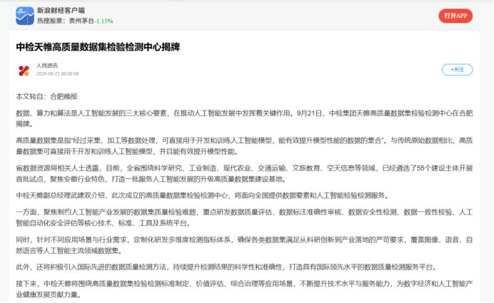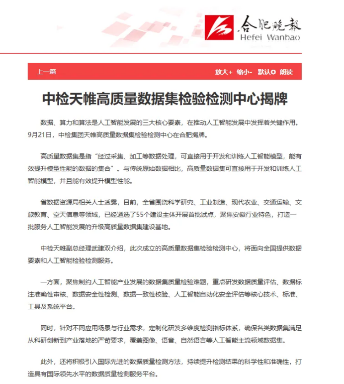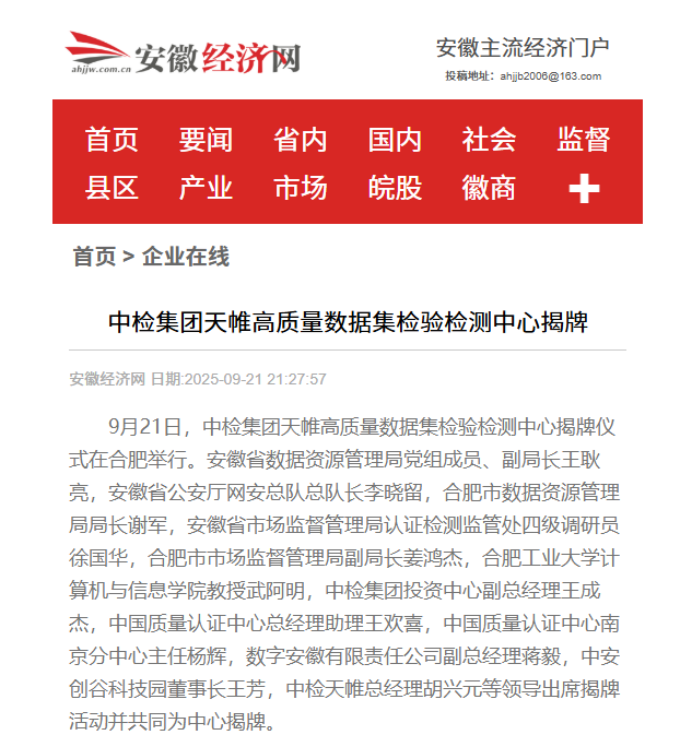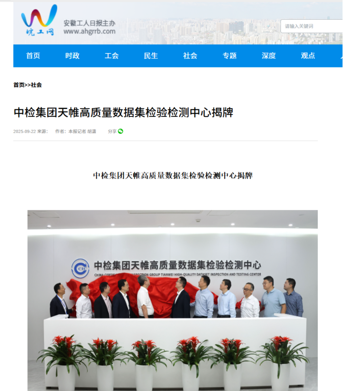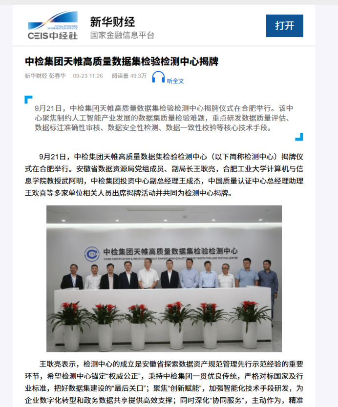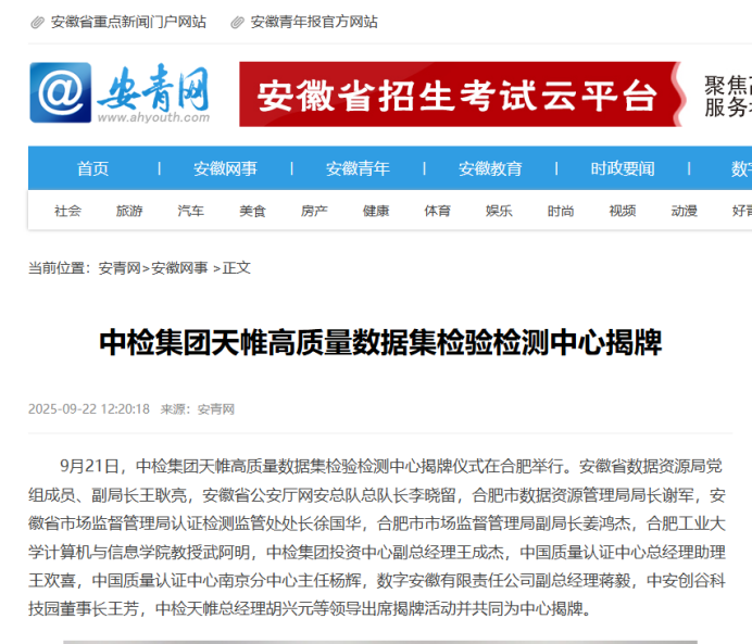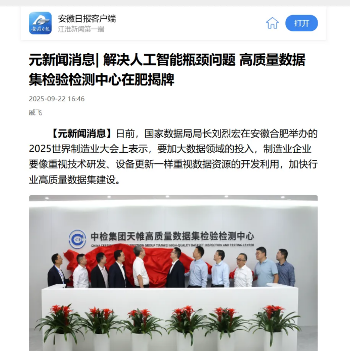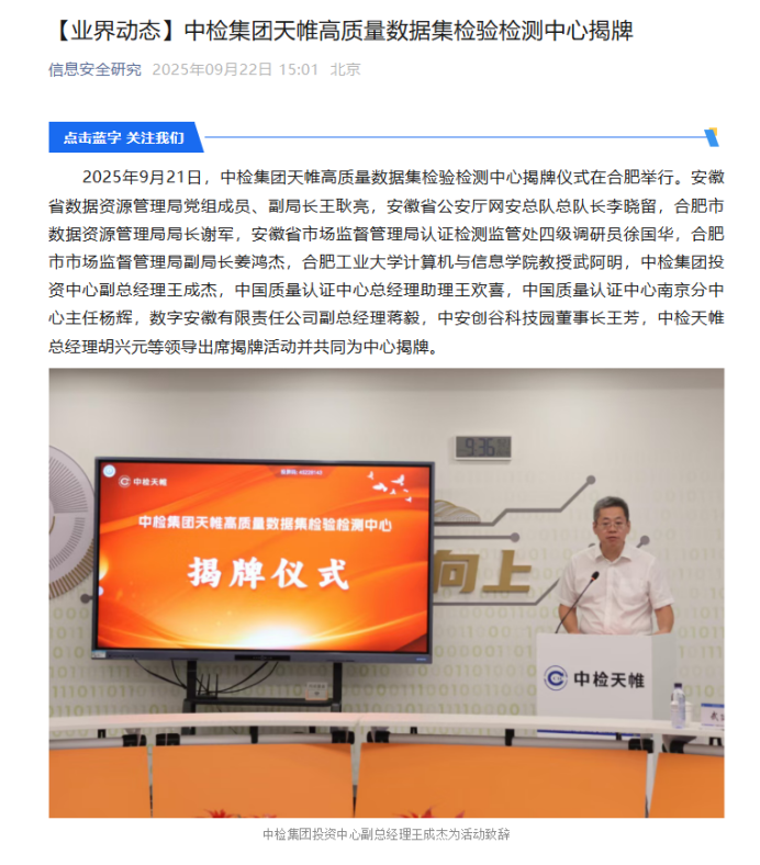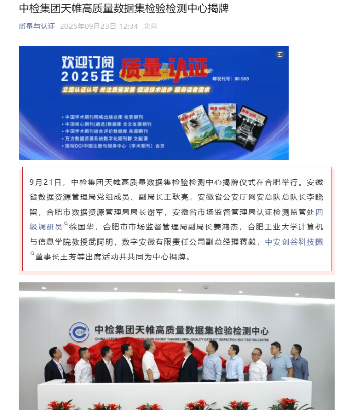 9月21日,中检集团太阳集团高质量数据集检验检测中心(以下简称“检测中心”)揭牌仪式在合肥举行。作为全国首家生态共建、央地合作的高质量数据集检验检测机构,迅速引发业内广泛关注和多家媒体报道,全网阅读量累计超过百万。