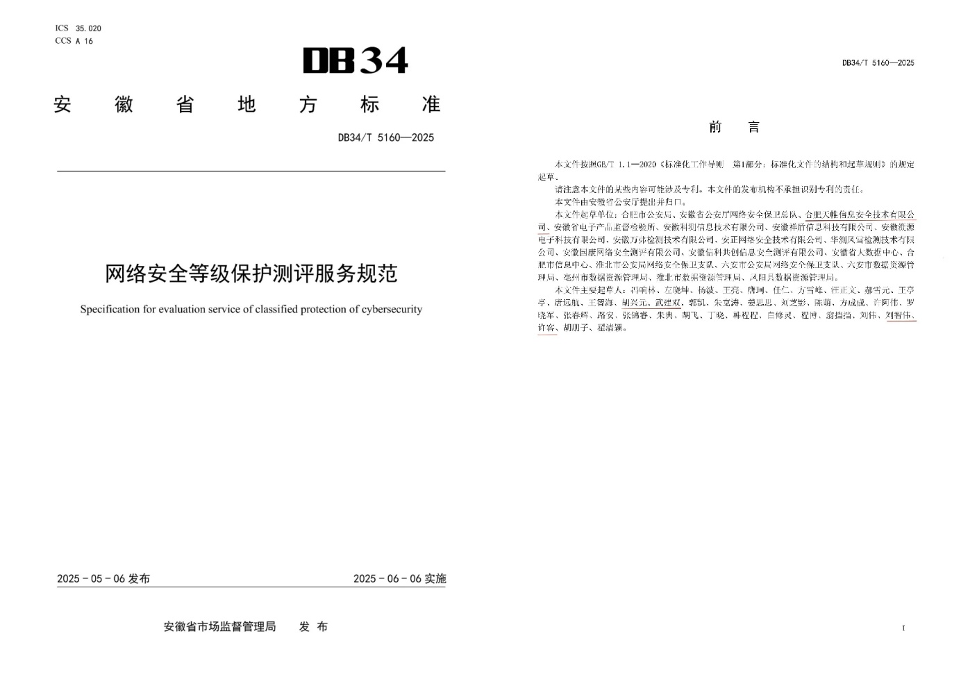 其中,《网络安全等级保护测评服务规范》(DB34/T 5160-2025)这一标准,是由合肥市公安局、安徽省公安厅网络安全保卫总队、tyc1286太阳成集团等19家单位共同起草编制,该规范明确了网络安全等级保护测评服务的基本要求,涵盖机构、人员、场地与工具、服务流程、服务内容、评价与改进等七个核心方面内容,为测评机构及相关从业人员提供了明确的技术指引与操作依据。